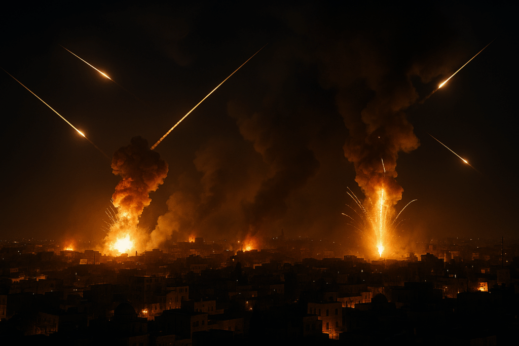 Foto aérea noturna de uma cidade do Oriente Médio em chamas, com o céu iluminado por mísseis e explosões, transmitindo a gravidade e a tensão do momento.